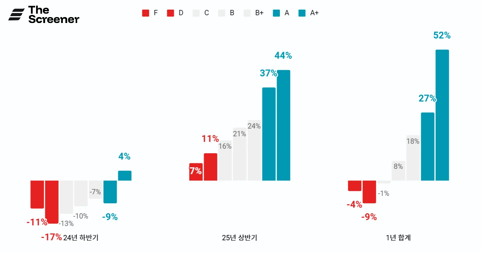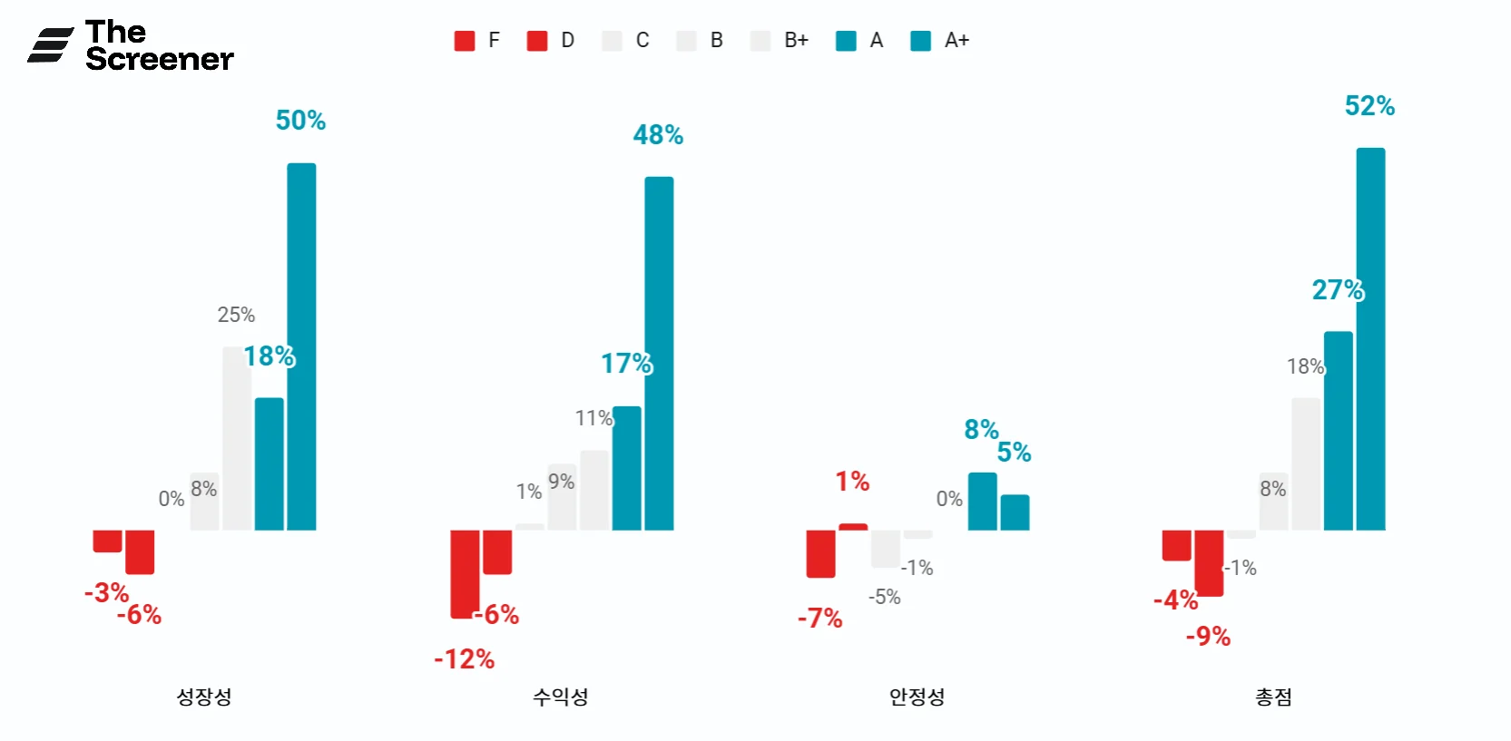 초록색은 재무점수가 A, A+ 등급의 평균 상승률을 의미합니다.